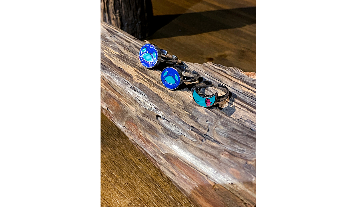 和谐戒指采用“阴阳”形状结合,一阴一阳,二者可拼合出馆藏荷花、螃蟹图样,蕴含生活和谐、夫妻美满、家庭幸福的美好寓意。