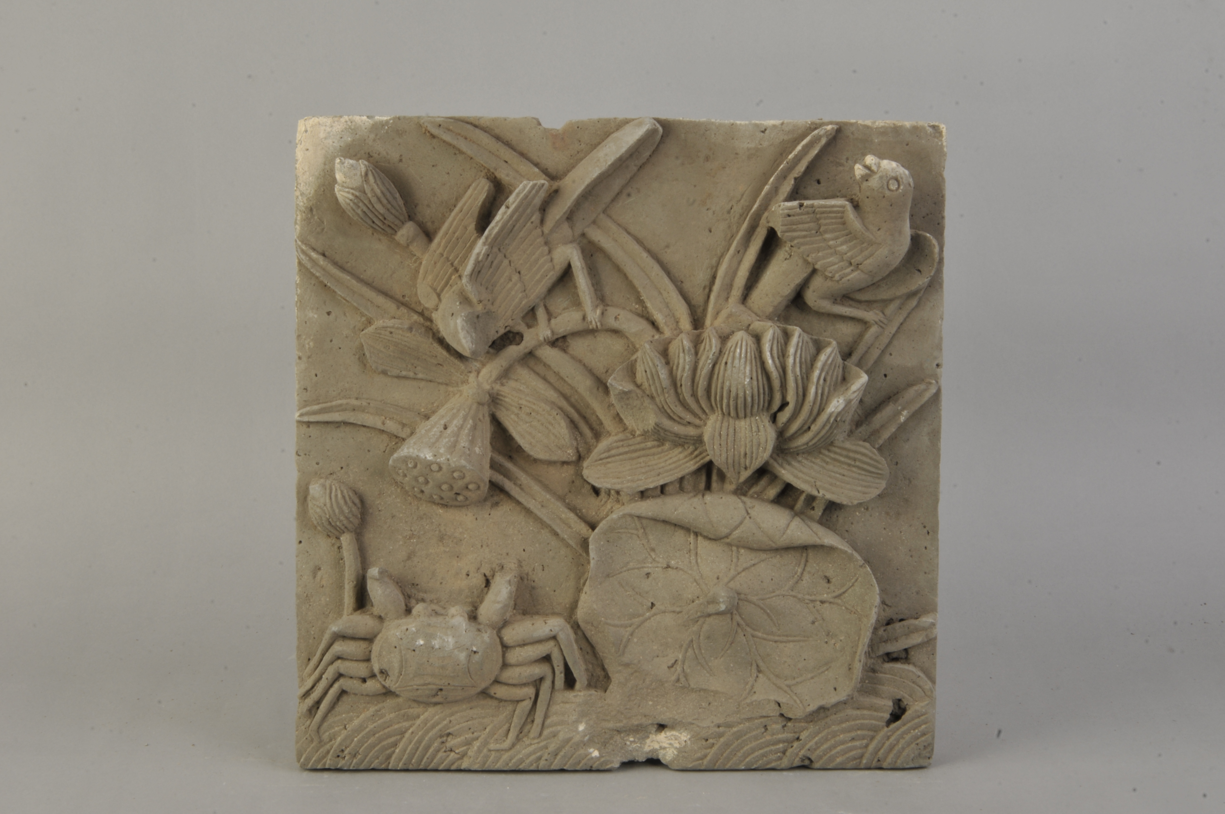 徽州古民居建筑上的装饰材料。砖面上雕刻的内容为池塘写实之景,荷花绽放,螃蟹横行,画面意境生动,题材别出新意。“荷蟹” 谐音“和谐”,是中国古代绘画的经典题材之一,体现了古人追求人与人、人与社会、人与自然和谐相处的理念。
