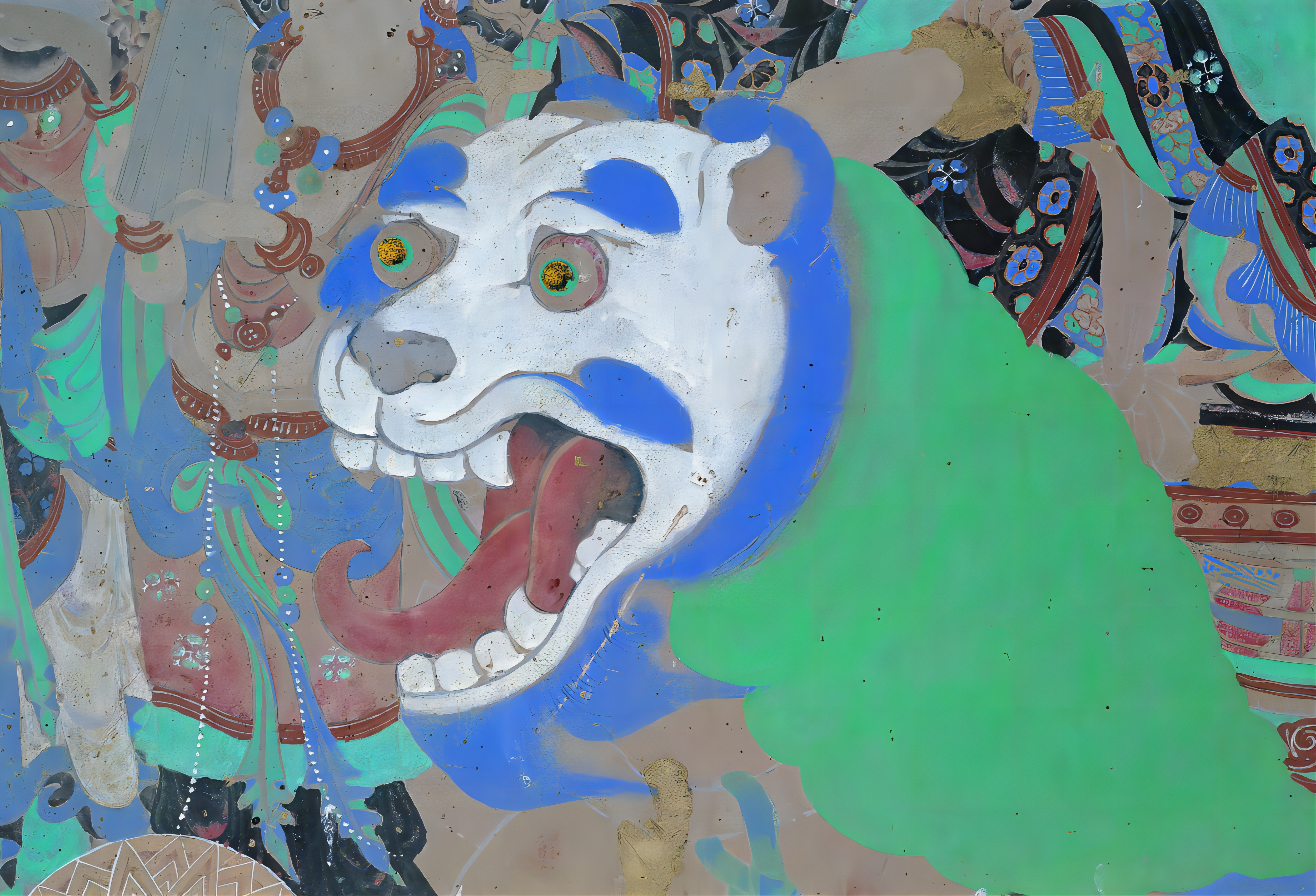 彩云山水之间,文殊菩萨乘青狮而来。文殊泰然静坐,狮子口目大张,似发出雷霆之吼,行走间威仪赫赫,响震四方。佛经中,文殊被奉为诸佛之师,主智德,其坐骑青狮,也因气魄悍勇,常被用来警喻佛法之无畏、智慧之威猛。