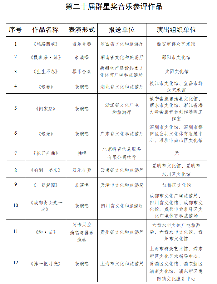 据悉,本次群星奖音乐终评分为两场进行,15:00开启第一场角逐,18:30开展第二场角逐。参与终评的27个音乐作品,经全国各省、自治区、直辖市及新疆生产建设兵团,北京抖音信息服务有限公司层层遴选推荐产生,现场呈现了一场高水准、多元化的群众文化艺术盛宴。
