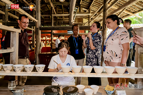 在陶阳里,非物质文化遗产代表性传承人孙立新用毛笔蘸上青花料,邀请外交官们共同创作。塞舌尔驻华大使安妮·拉福蒂纳用毛笔蘸取颜料,在瓷坯上点染出波浪纹,孙立新接过瓷坯,以青花勾勒出浪花和鱼,两种笔触在瓷胎上形成奇妙对话。“这是塞舌尔的风与景德镇的昌江水在共舞。”孙立新笑着说。