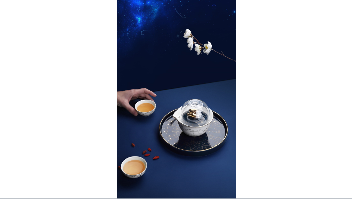 礼盒包括茶壶、主人杯、品茗杯、点心盘、香盒、刀叉。主人杯选用双层玻璃,光滑易清洗,保温隔热,精致的刀叉组合通体金色,熠熠生辉,既可日常使用也可待客送礼。礼盒颜色选用星空蓝色调,仿佛与古人一道置身浩瀚星空。