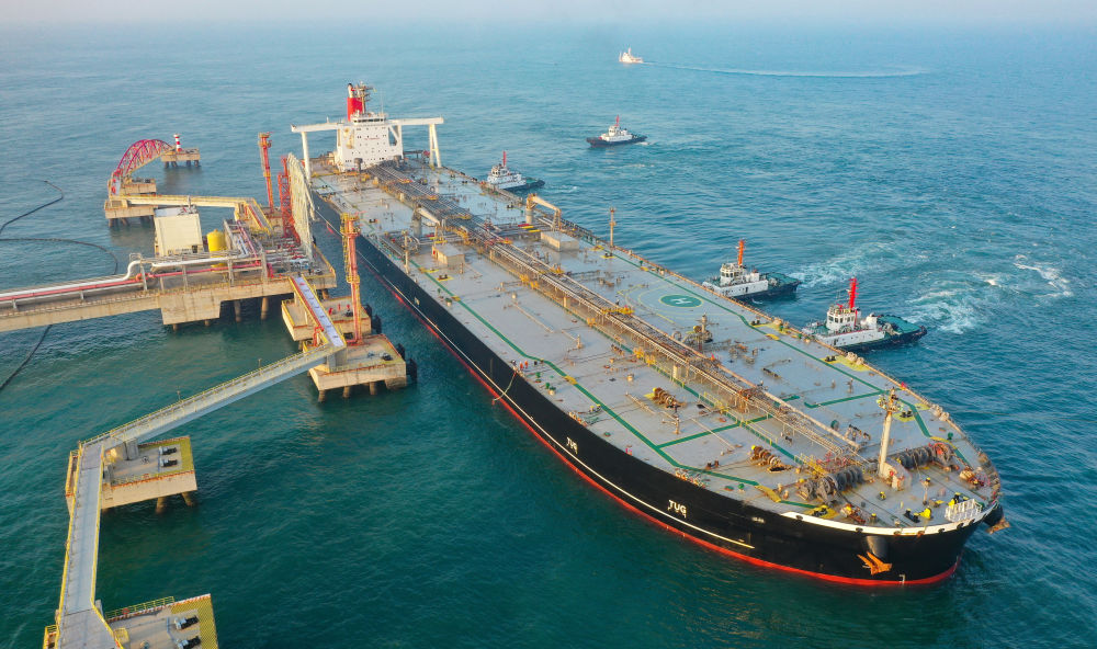 2025年12月18日,一艘装载着石化原辅料的外籍船舶泊入位于海南省儋州市的国投洋浦油储码头30万吨级原油泊位(无人机照片)。