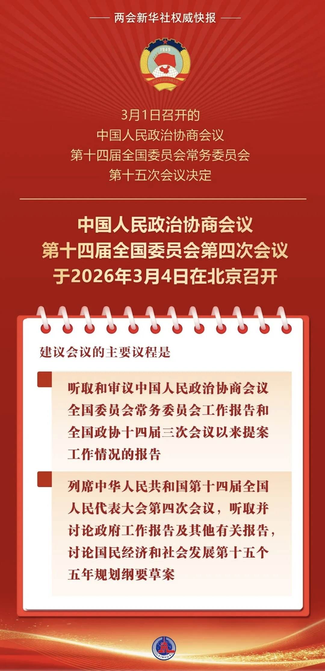 中国人民政治协商会议第十四届全国委员会第四次会议于2026年3月4日在北京召开