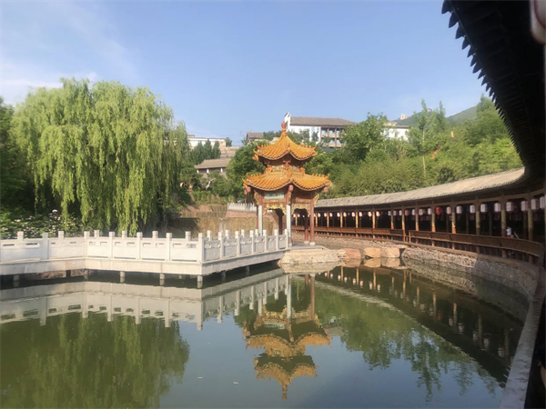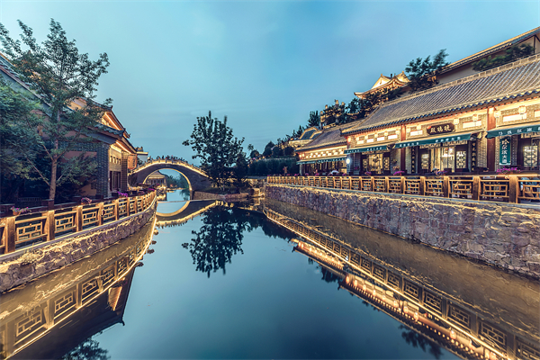 2.西部长青·德明古镇:德明古镇坐落在山光明媚、水色秀丽的问情 谷,是一座以古老璀璨的元曲文化为主题的特色小镇。德明古镇全长 两公里,在建筑特色上吸纳了金元明清时期我国建筑的精华,亭台楼 阁设计精巧、古朴厚重、典雅大气。一条清澈的河水穿镇而过,让游 人体验到秦淮河边的古老风情。古诗中描述的“ 白墙灰瓦雨如烟,古意石桥月半弯 ”的景致,在这儿得到了充分诠释。