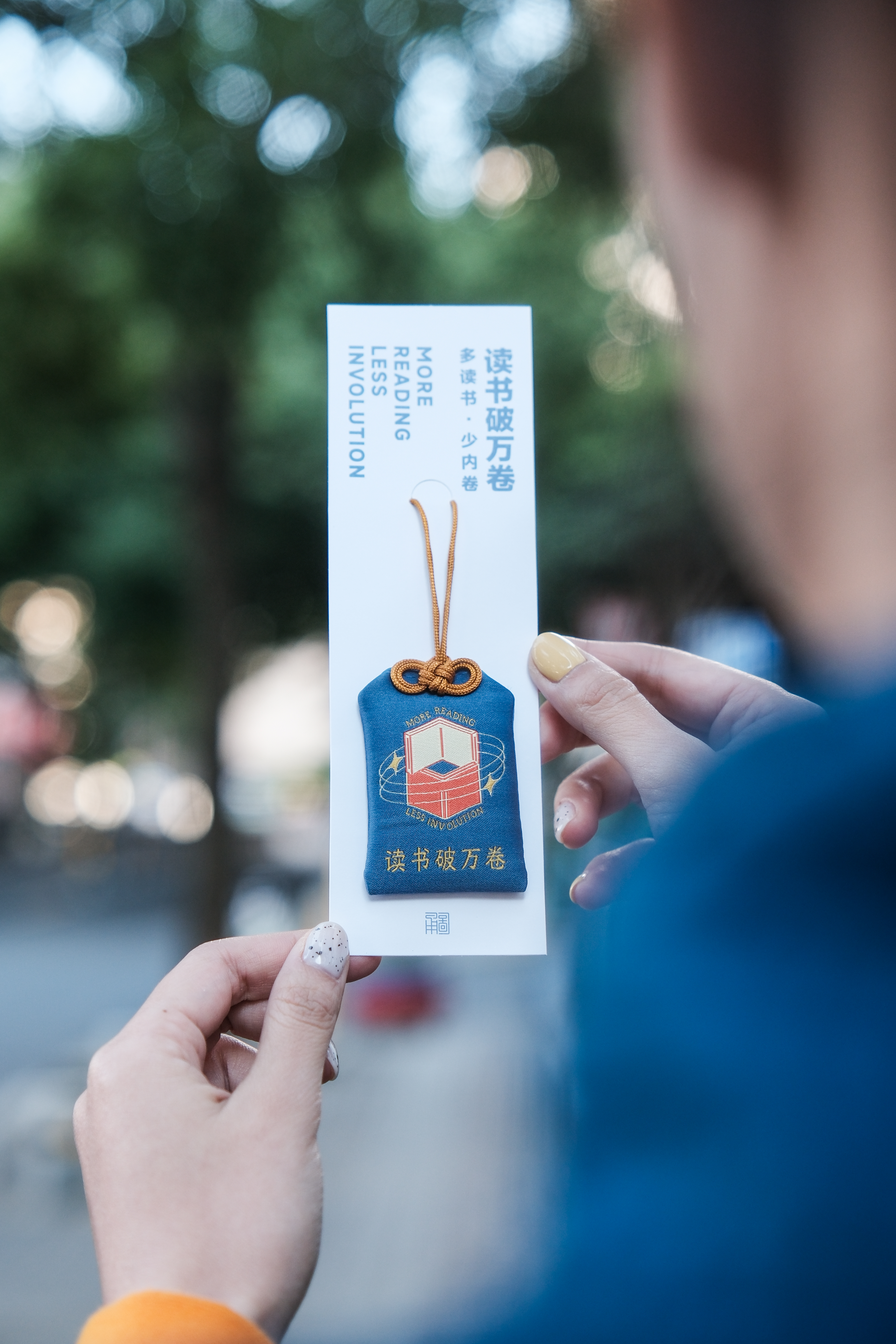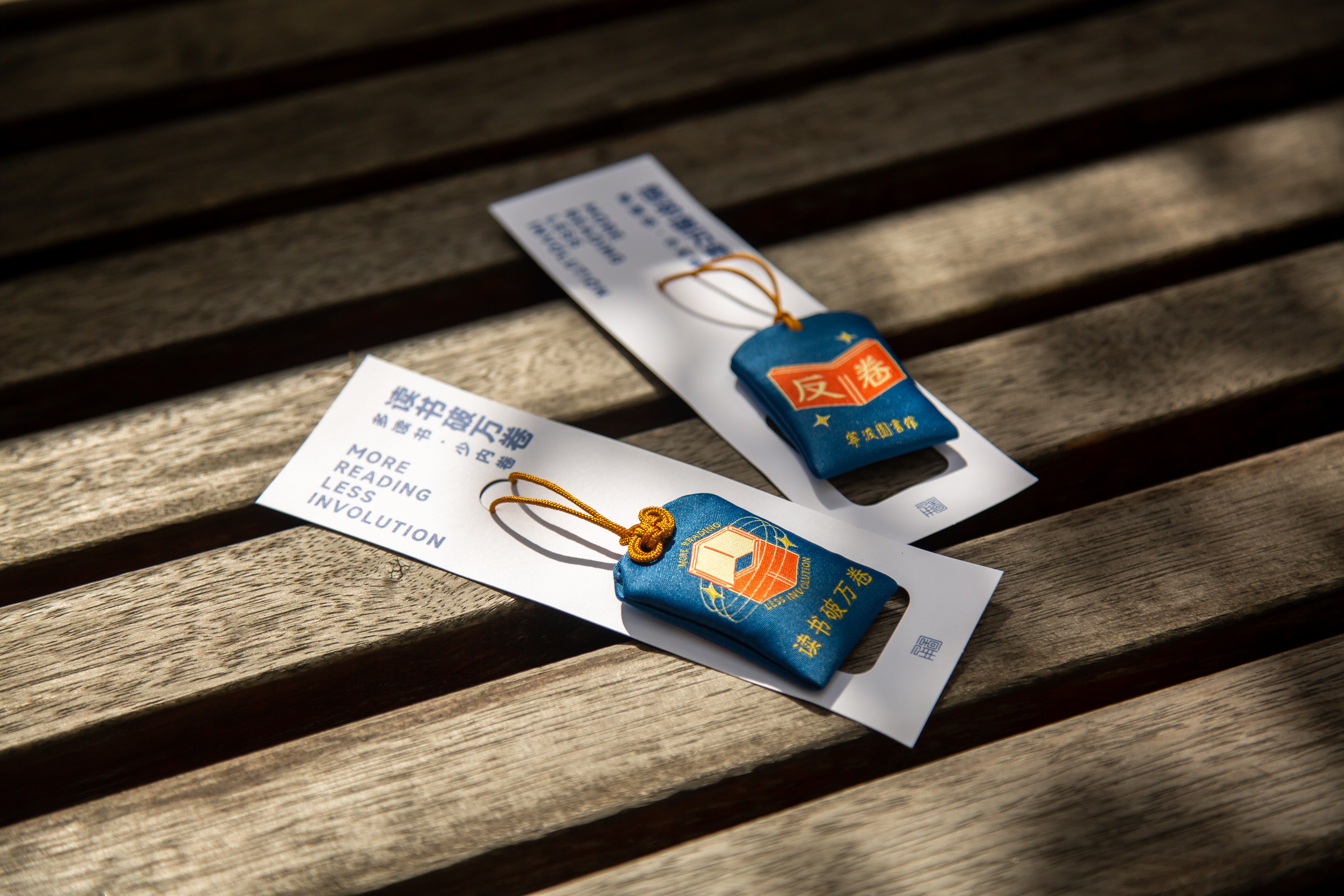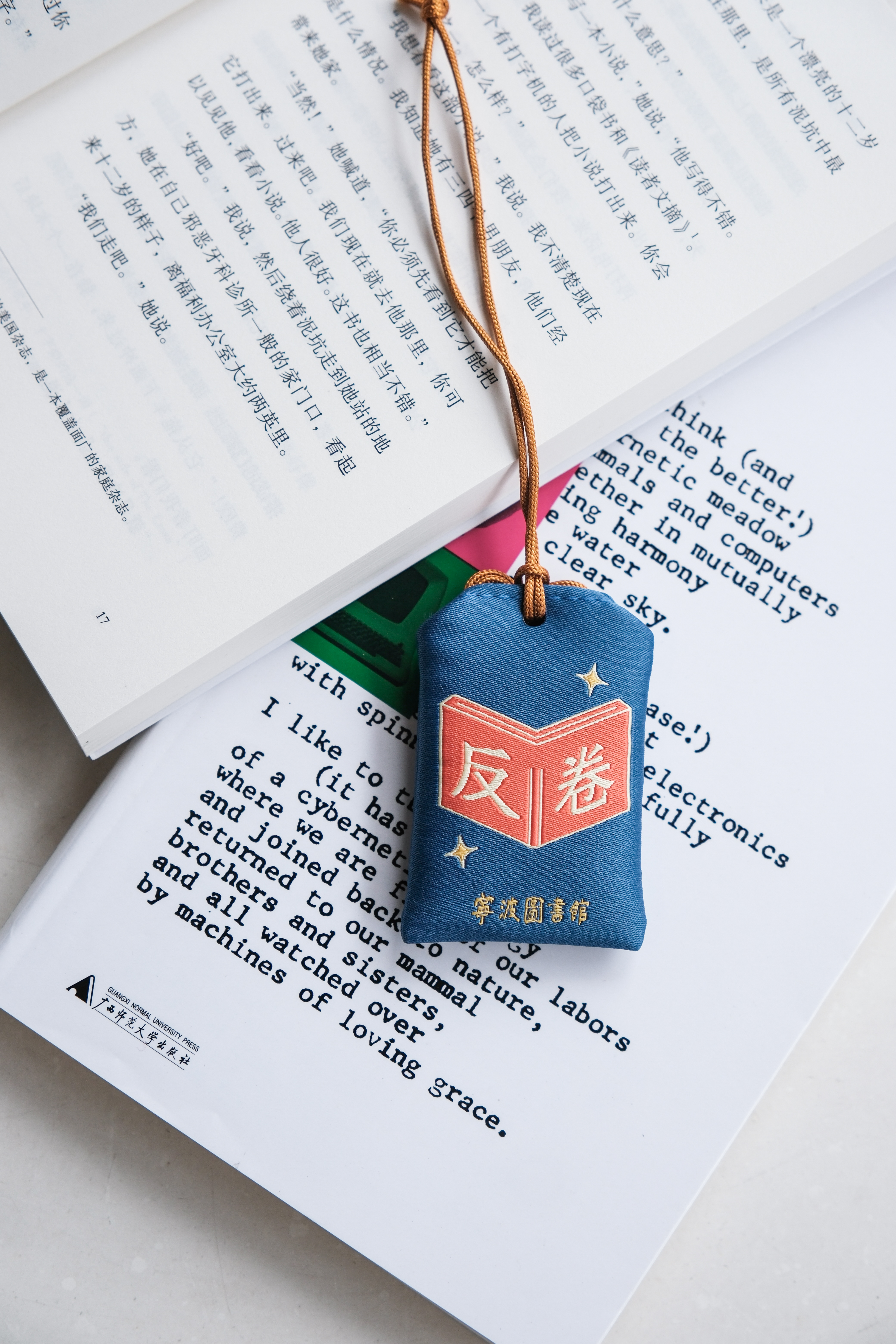 宁波图书馆用“读书破万卷”作为创意来源,提出“反卷”理念,倡导大家“多读书,少内卷”,以书慰藉,反卷成功。反卷“御守”自带艾草等“书香”气息,红蓝黄经典配色充满中国传统韵味。
