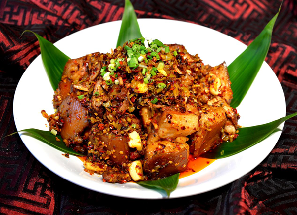 梅王宴:安化,古为“梅山峒蛮”之地,梅王宴是源于安化的传统民俗和饮食文化。梅王宴的食材以当地特产为主,如安化黑猪肉、腊肉、茶叶等山珍野味,注重原汁原味,多采用炖、煮、熏等传统烹饪方法,味道醇厚,主要菜品包括马帮肉、排帮鱼、苗峒鸭、瑶家锅、五郎鸡等。