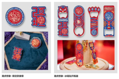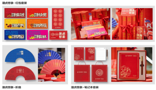 通过对虎纹金牌的形态分析和修改制作了一系列例如扇子、冰箱贴、笔记本、手提袋等文创产品。产品流化画图,颜色填亮;对虎爪作修改,花纹简化;面部进行花纹调整,整体优化,还原文物金片捶操的浮雕效果。突出虎崇月文化,表现勇强、正直与力量。颌下前爪,突出极富标击性的复体反转和动感。