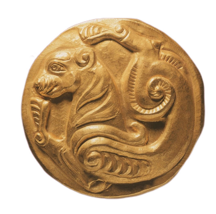 圆形金牌内用模压捶操的方法制出一只凸起的老虎,为随圆金牌之形,取老虎昂首、扭颈、转身的姿态,这样使圆牌内虎的造型既均匀又不失虎的灵敏、威武之风。这件虎纹金牌饰与狮子形金牌饰,对虎纹金箔带同出于阿拉沟遗址30号墓。此墓为竖穴木椁墓,用石块封堆,四周用卵石围砌成长方形石垣,墓圹在石垣的中部,呈长方形竖穴,圹底部用松木纵横叠置成高1米多的椁室。