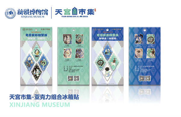 “天宫市集”品牌IP在保留原壁画艺术的基础和魅力之上,保留蓝靓色、石青和石绿色共同构成的冷色调,提取壁画中的相关文物元素,使龟兹文化与现今的流行潮流事物相结合,赋予它们“崭新的生命力”。