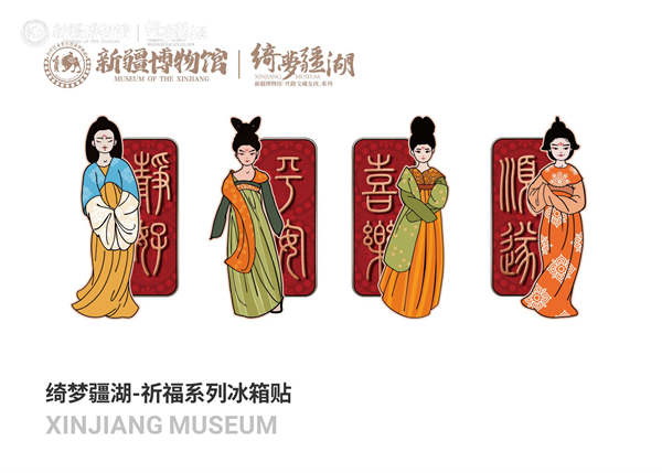 新疆博物馆以馆藏藏品唐代女俑为原型,打造4位分别代表赛里木湖、博斯腾湖、喀纳斯湖、天山天池的丝路宝藏女孩,化身美丽湖灵,为中华大地演绎属于新疆的绮丽风情。设计团队将美丽的湖景与唐代女佣形象进行创造性地联系,分别赋予舞女俑——翡翠湖灵、彩绘戴帏帽骑马仕女泥俑——落霞湖灵、彩绘仕女木俑——海蓝湖灵和女舞俑——墨绿湖灵,不仅用IP形象更加生动地表现了新疆圣湖的美丽特色,更让湖景与人文产生了更加生动的联想。